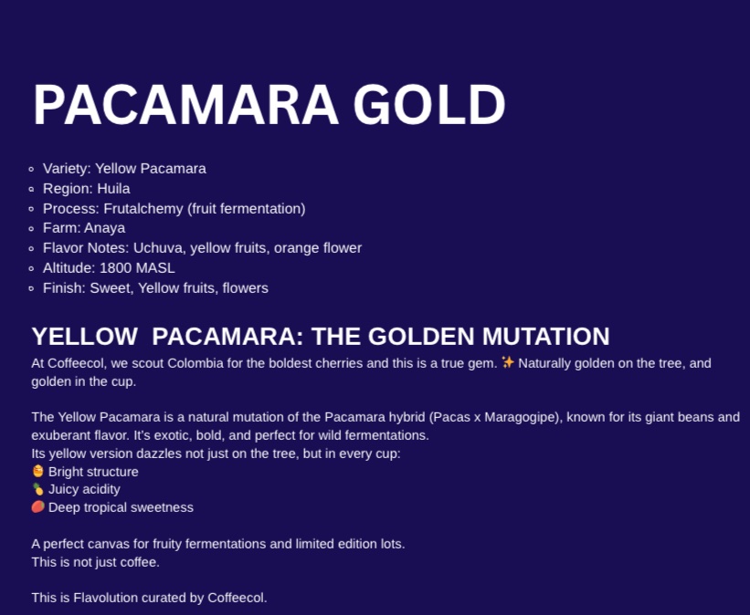 Origin & Variety: 100% Pacamara – known for its large beans and complex cup.